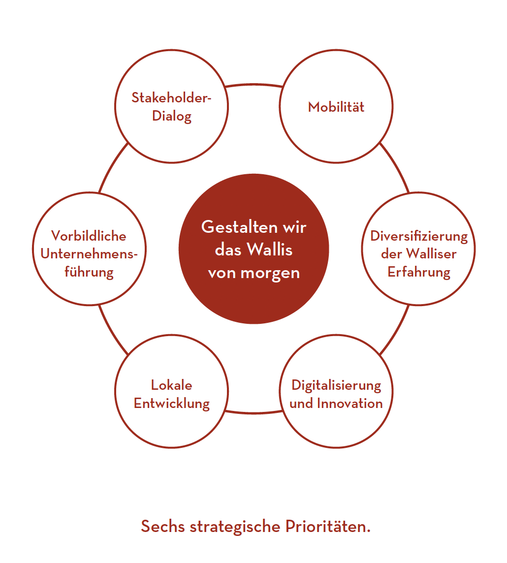 Die Strategie 2025–2028 schliesst an diejenige von 2021–2024 an. Valais/Wallis Promotion möchte damit die bisherige Strategie fortführen und zugleich mit seinen Partnern einen nachhaltigen Mehrwert für den Kanton schaffen. VWP richtet seine Organisation konsequent auf die Hauptmärkte Schweiz, Europa und die Fernmärkte aus.